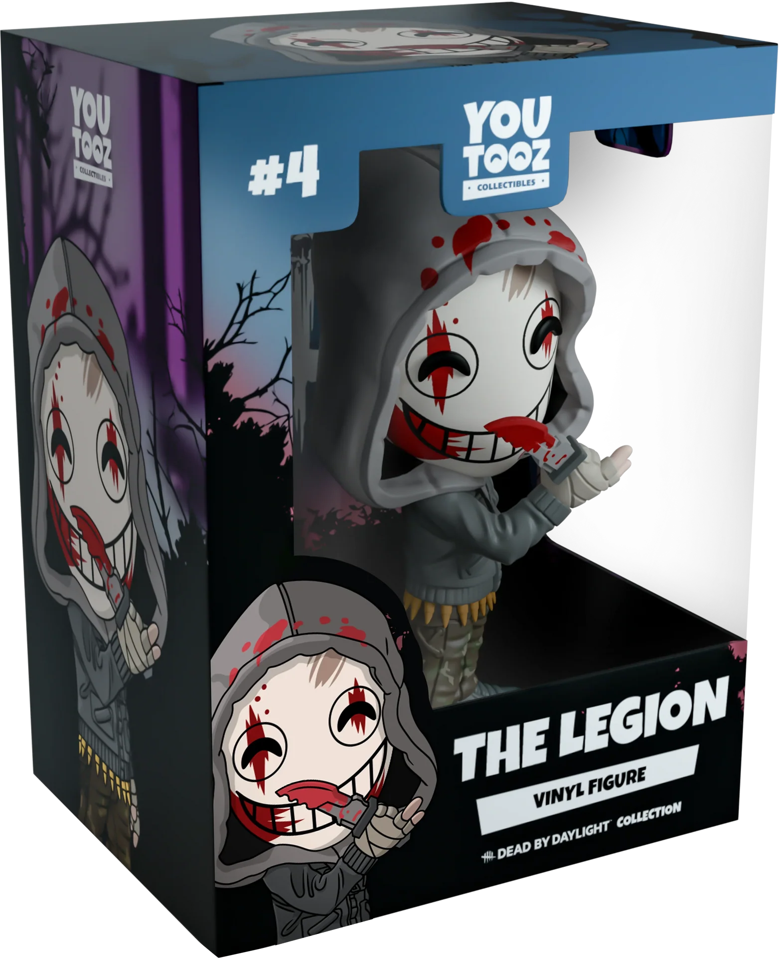Legija urla u Youtooz u silovitom bijesu! Visok 12 cm i držeći krvlju natopljeni lovački nož u jednoj zavijenoj ruci s dva prsta u zraku, njihova nasmiješena bijela maska viri kroz debelu kapuljaču jakne i umrljana je jarko crvenim ostacima njihove najnovije žrtve. S torbama za zalihe na sivo-plavoj jakni i smeđim kamuflažnim hlačama, nose žuti pojas s mecima oko struka i čvrste sive čizme. Vanjski dio njihovog pakovanja prikazuje Legiju kako se gleda u ogledalu s rukama pritisnutim uz staklo. Dok je unutrašnjost šuma u crnoj silueti sa sjajnom crvenom i plavom maglom i bijelim logotipom 'Dead by Daylight' na poleđini, ovaj zlokobni dizajn se zatim nastavlja na zaštitni omot s tamnim drvećem koje ga potpuno okružuje, dok se njihova silueta može vidjeti kroz veliki prozirni prozor na prednjoj strani. Ovaj kolekcionarski predmet dolazi u zaštitnom, reljefnom, mat vanjskom omotu i plastičnom zaštitniku prilagođene veličine za maksimalnu zaštitu tokom transporta.