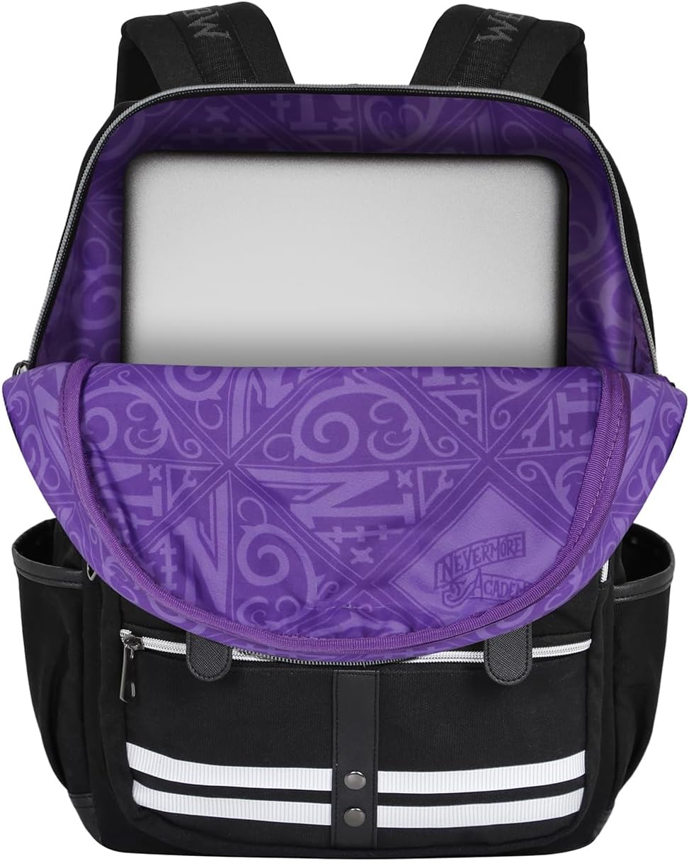 Η Karactermania παρουσιάζει τη σειρά της από υψηλής ποιότητας σακίδια πλάτης με θέμα την επιτυχημένη σειρά του Netflix Wednesday. Ανακαλύψτε ξανά τον κόσμο της Wednesday Addams με αυτό το υπέροχο σακίδιο πλάτης με ρετρό έμπνευση, το οποίο διαθέτει δύο θήκες με φερμουάρ και καπάκι με λουράκια, εσωτερική επένδυση με επενδεδυμένη τσέπη για ηλεκτρονικά είδη και δύο πλαϊνές τσέπες. Διαθέτει επίσης πίσω ιμάντα αποσκευών και ρυθμιζόμενους επενδεδυμένους ιμάντες ώμου.