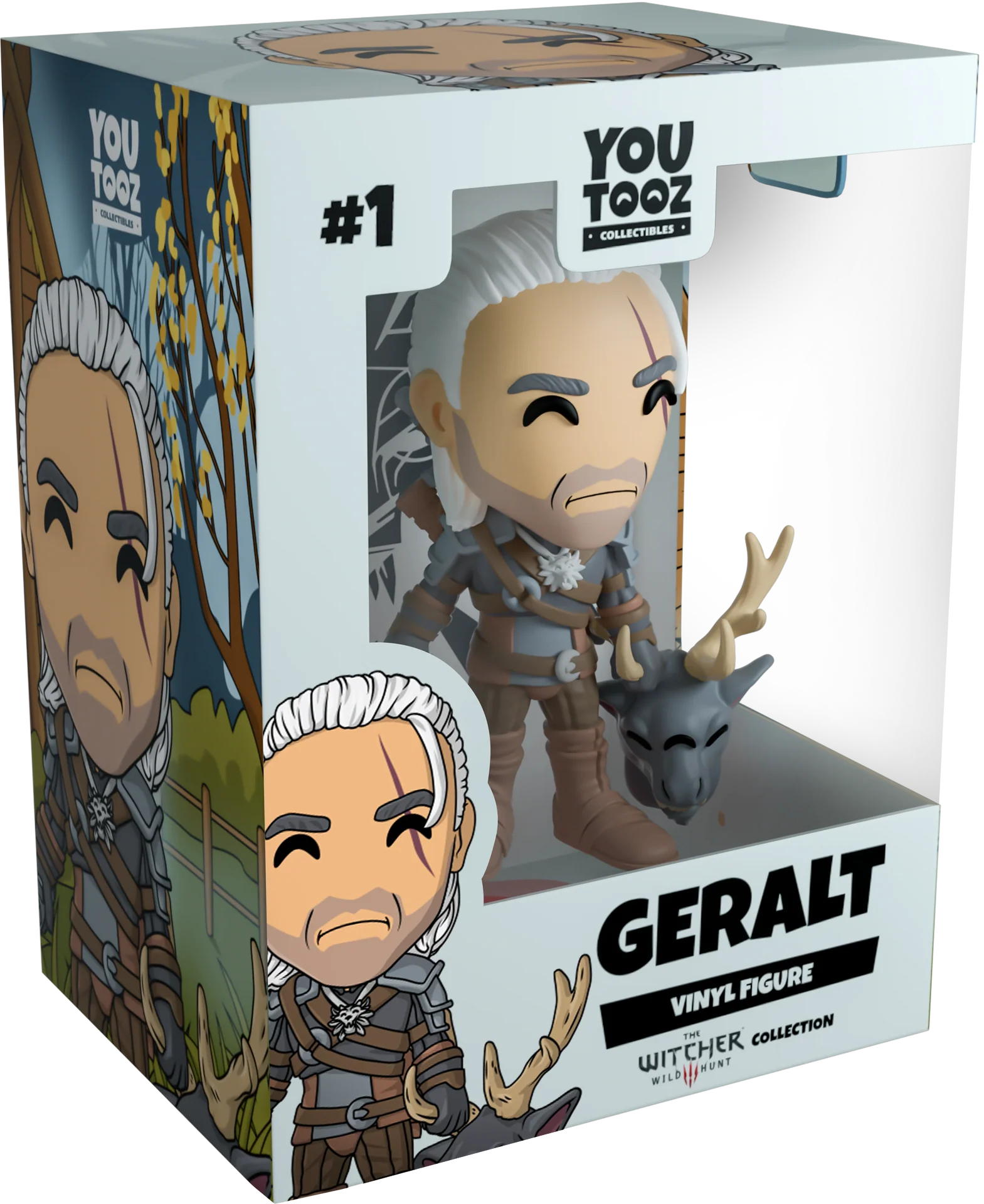 At 11.7 cm tall, Geralt of Rivia makes his debut on Youtooz! Sporting his signature half-up, half-down hairstyle, a white lock hangs over the left side of his forehead. A deep emotion is evident on his face, and a dark scar crosses his left eye. His outfit, made of leather and steel, is complemented by a Witcher necklace worn around his neck. In his right hand, he holds a steel sword, while in his left, he holds the head of a monster Geralt has defeated. Strapped across his chest and slung across his back, another sword is ready to be used whenever needed. The exterior of his double-walled packaging depicts the misty woods where Geralt walks, holding the monster's head. The interior features a light blue to faded white background, with red flames toward the bottom and The Witcher symbol printed in the center. This collectible comes in a matte, embossed protective sleeve and custom-sized plastic sleeve for optimal protection during shipping.