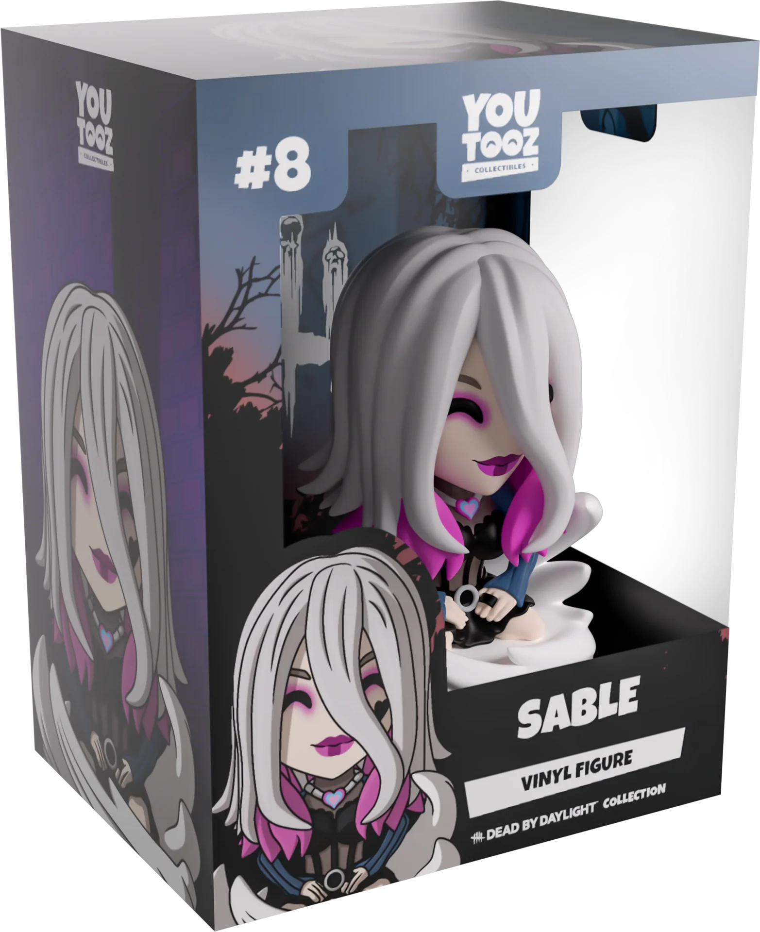 In her quest to find her friend Mikaela, Sable has found herself in the basement of Youtooz with plenty of time to pose for a collectible figure! Measuring 3.5 inches tall and designed to show Sable in a kneeling position with her hands resting on her thighs as light gray smoke swirls around her, she is dressed in a black dress with corset stays down the front. With arms sheathed in a ribbed blue bolero top and a gray necklace around her neck with a heart charm in the middle, her gray and pink hair falls over her shoulders and frames her face while highlighting the heart tattoo on her cheek. The glass display box was designed to showcase the ticket booth of an old movie theater at night. While the interior is a black silhouetted forest with a glowing red and blue mist and the white "Dead by Daylight" logo on the back, this sinister design then continues onto the protective sleeve with dark trees completely surrounding it as their silhouette can be seen through the large clear window on the front. This collectible comes in a protective matte, embossed outer sleeve and a custom-sized plastic protector for maximum protection during shipping.