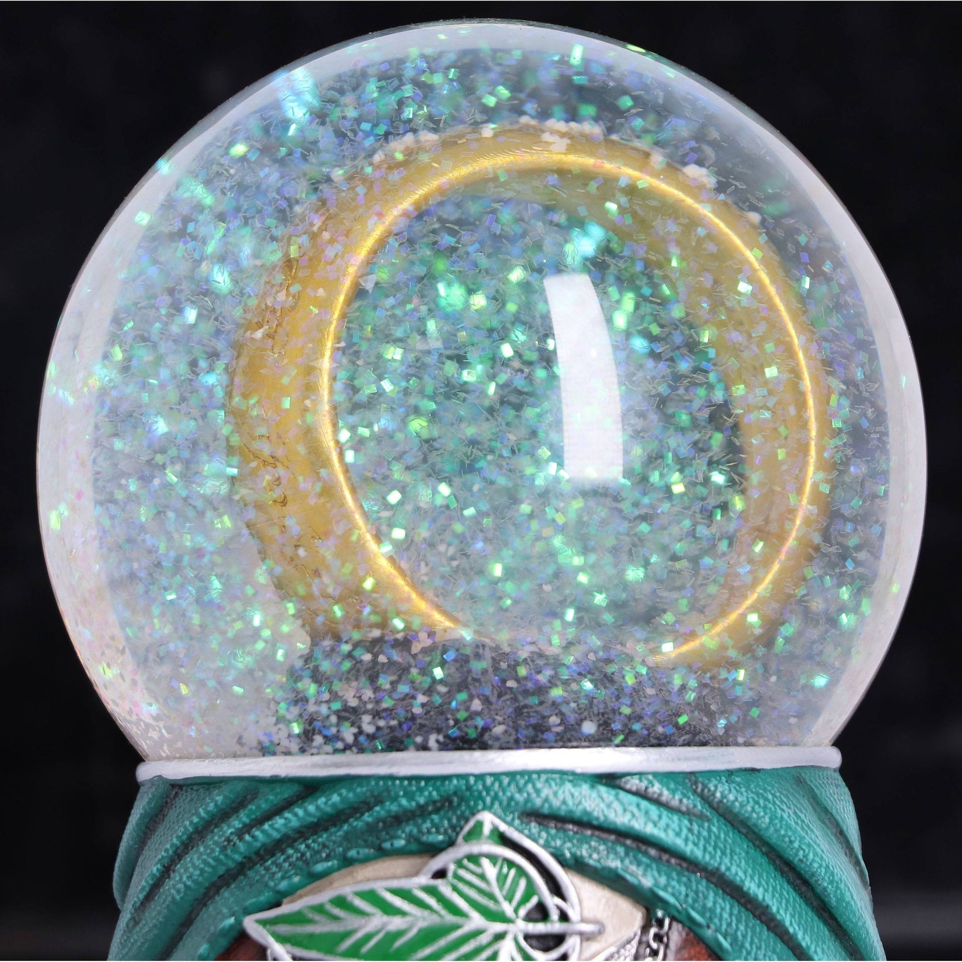 The base of this beautifully crafted snow globe is formed by Frodo's green cloak, the front of his buttoned brown blazer and his off-white shirt. The iconic Leaf of Lorien is positioned just below the top edge and makes the perfect centrepiece. On the reverse, it bears the quote 'Even the smallest person can change the course of the future'. Inside the globe, the One Ring takes centre stage, surrounded by the words 'One Ring to Them All'. This exquisitely designed piece is cast in the finest 'elven' resin before being expertly hand-painted.