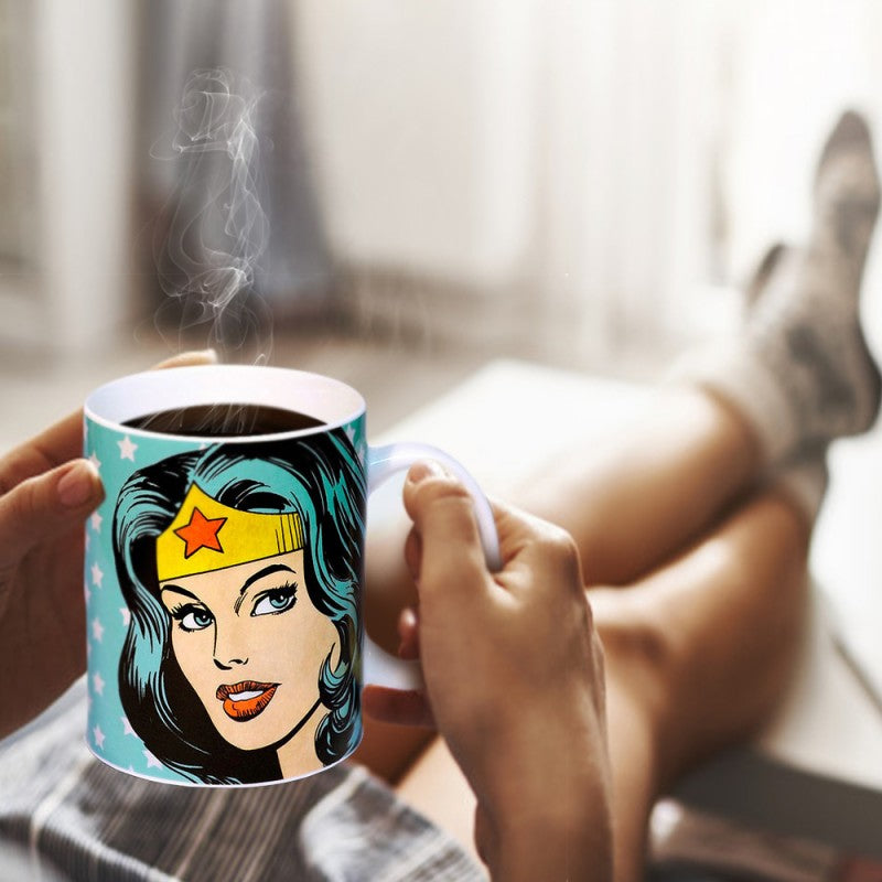 This cute, officially licensed Wonder Woman ceramic mug features the superheroine's logo.