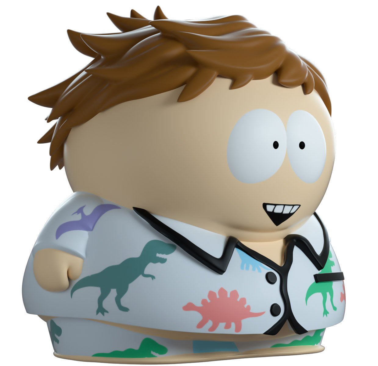 Good morning from Cartman himself! I too would look so happy when I woke up every morning, especially if I had these incredibly drippy dinosaur pajamas! Measuring 3.3 inches tall, Cartman is seen freshly awakened from a good night's sleep, wearing matching pajamas. The top and bottom are both light gray in color, complemented by a dinosaur pattern on the top and pants in different colors like red, green, blue and purple. With his hair very seemingly lying down, Cartman has a huge smile on his face. The exterior of his double-walled package shows the interior of his room, with some clothes scattered on the floor. The interior is the South Park logo repeating on a grayscale pattern. The slipcover shows Cartman, Stan, Kenny and Kyle watching from the corners against a black background. This collectible comes in a protective embossed matte outer sleeve and a custom-sized plastic protector for maximum protection during shipping. shipping.