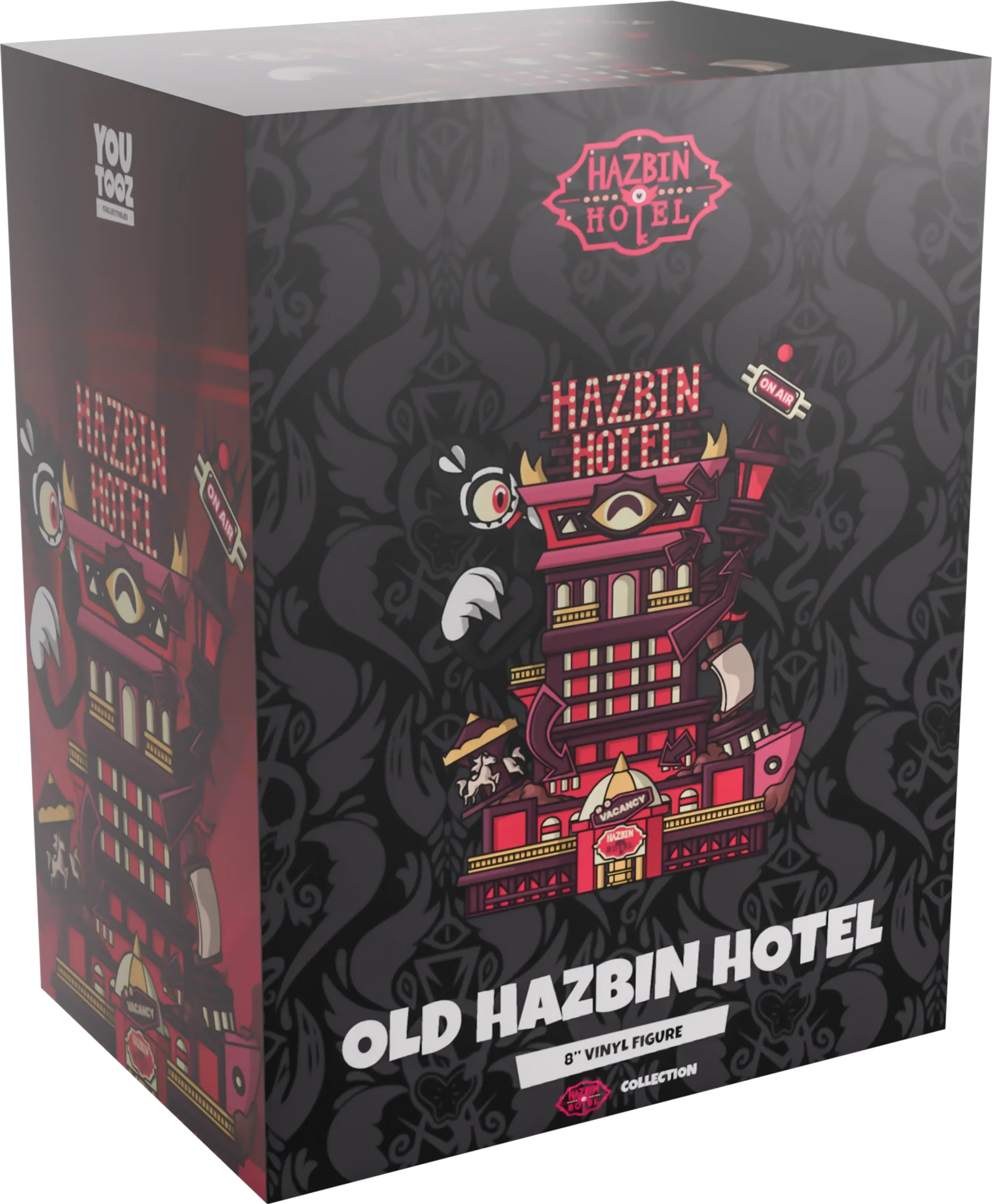 Le voici, dans toute sa splendeur, l'hôtel Hazbin ! D'une hauteur de 18 cm, avec un grand panneau sur son toit, tandis qu'un KeeKee curieux est appuyé d'un côté et qu'une grande flèche s'étend de l'autre avec un signal « On Air » au sommet, un grand œil se trouve au premier plan et au centre au-dessus des nombreux étages et fenêtres du bâtiment. Couvert de flèches pointées et avec un panneau « No Vacancy » posé au hasard au-dessus de l'entrée, un grand navire surgit du côté de l'hôtel et est reflété par un carrousel décalé. Cet objet de collection est livré dans un emballage conçu avec amour qui voit l'intérieur recouvert d'un motif rouge et gris complexe qui imite le papier peint de l'hôtel qui se poursuit sur l'extérieur alors que l'hôtel se trouve sous un pentagramme géant dans le ciel.