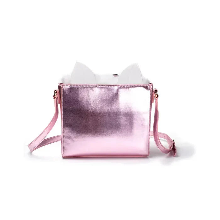 Чанта за рамо од вештачко крзно Мари со преклоп, везено лице, металик розов PU материјал, PU уши и целосно печатена внатрешна постава. За шик изглед.