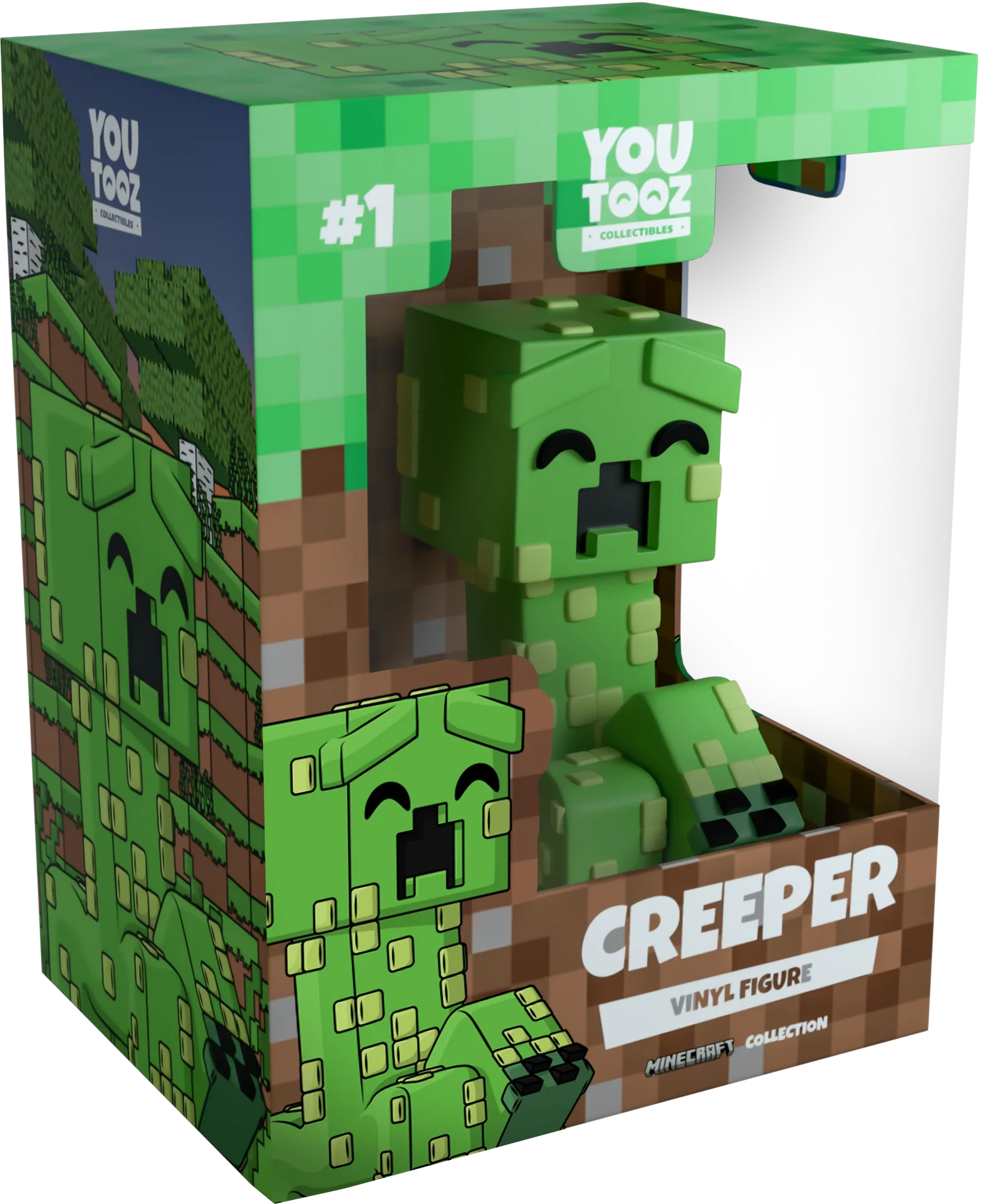 En entrant dans Youtooz à 10 cm de haut et prêt à exploser, ils avancent avec une patte avant levée tandis que les trois autres sont plantés au sol. Avec des sourcils levés et des yeux et une bouche noirs profonds, leur tête cubique repose inclinée sur un corps vert en blocs recouvert de carrés vert clair. L'extérieur de leur emballage montre un Creeper explosant dans les airs au-dessus d'un champ rocheux. Tandis que l'intérieur les entoure de premiers blocs bruns, qui se poursuivent sur la pochette de protection tandis que leur silhouette peut être vue à travers la grande fenêtre transparente à l'avant de l'emballage. Cet objet de collection est livré dans une pochette extérieure protectrice mate et gaufrée et un protecteur en plastique de taille personnalisée pour une protection maximale pendant l'expédition.