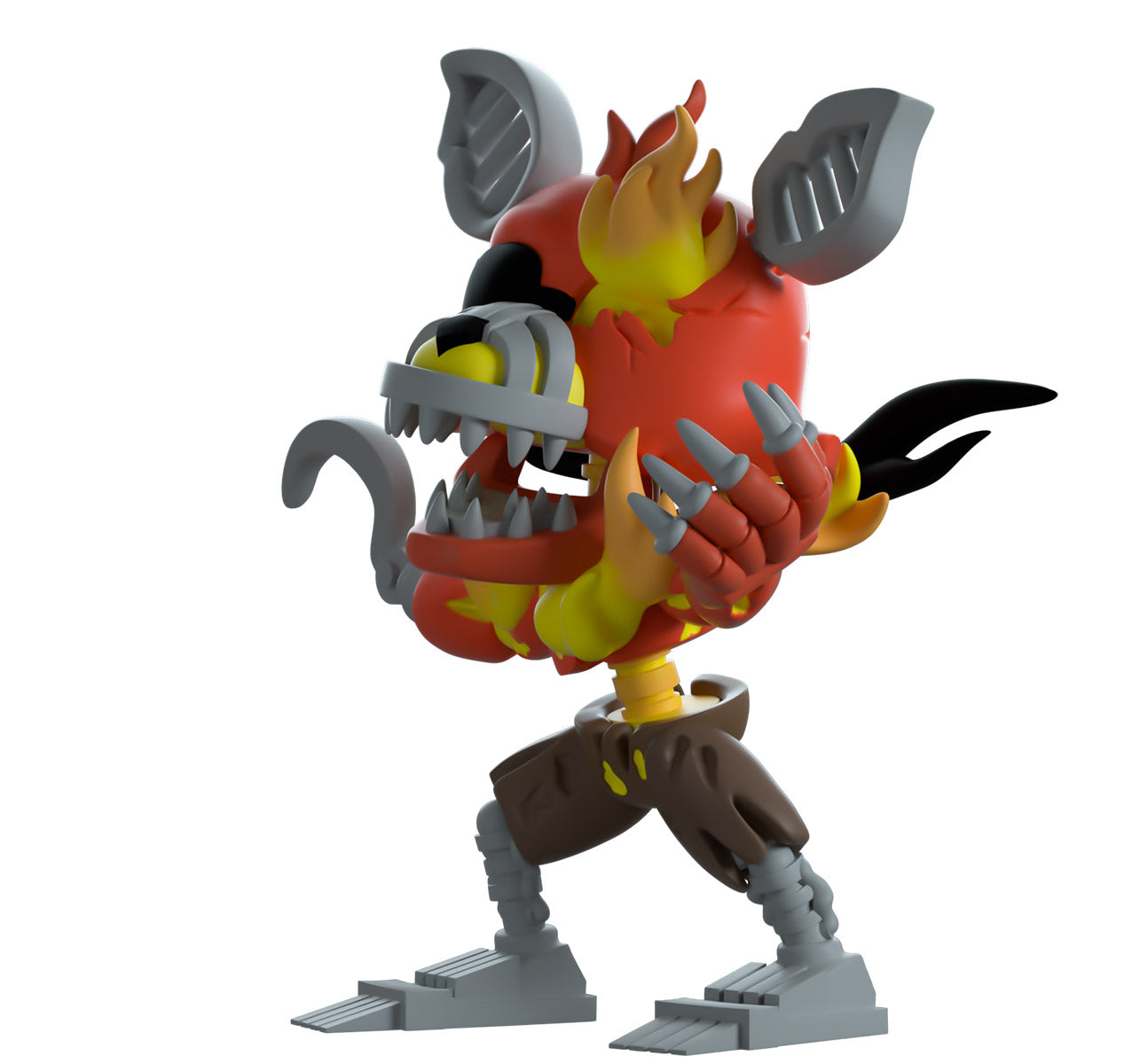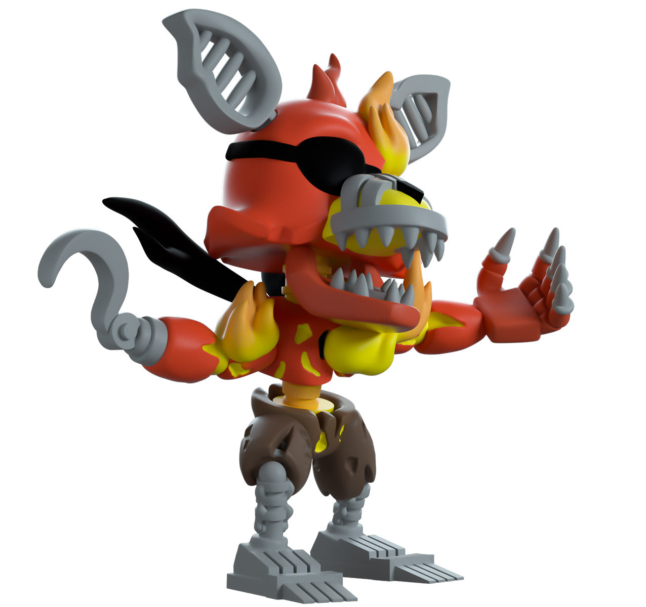Debout à 4,3 pouces de hauteur, les bras écartés tandis que des flammes roulent sur son corps hagard et jaillissent d'un œil sans cache-œil, des oreilles métalliques pointues jaillissent de leur tête rouge tandis que des dents grises acérées grincent sur leur museau. Avec un long crochet incurvé d'une main et des griffes acérées de l'autre, des ailes noires pointues émergent de son dos tandis que des jambes métalliques dépassent un short marron en lambeaux. L’extérieur de l’emballage de Grimm Foxy le voit jeter un coup d’œil au coin d’un labyrinthe en bois éclairé, tandis que l’intérieur présente un motif carré brillant vert foncé et noir et le logo « Security Breach ». Le manchon de protection est d'un bleu métallique foncé avec des tuyaux gris et des fils colorés qui le traversent et affiche la silhouette de Grimm Foxy à travers la grande fenêtre transparente située à l'avant. Cet objet de collection est livré dans une pochette extérieure de protection mate en relief et dans un protecteur en plastique de taille personnalisée pour une protection maximale pendant l'expédition.
