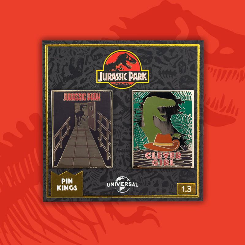 - Deux épingles en métal émaillé dur de qualité supérieure avec une finition brillante avec «Bienvenue à Jurassic Park» et les logos classiques de Jurassic Park sur une carte de support.