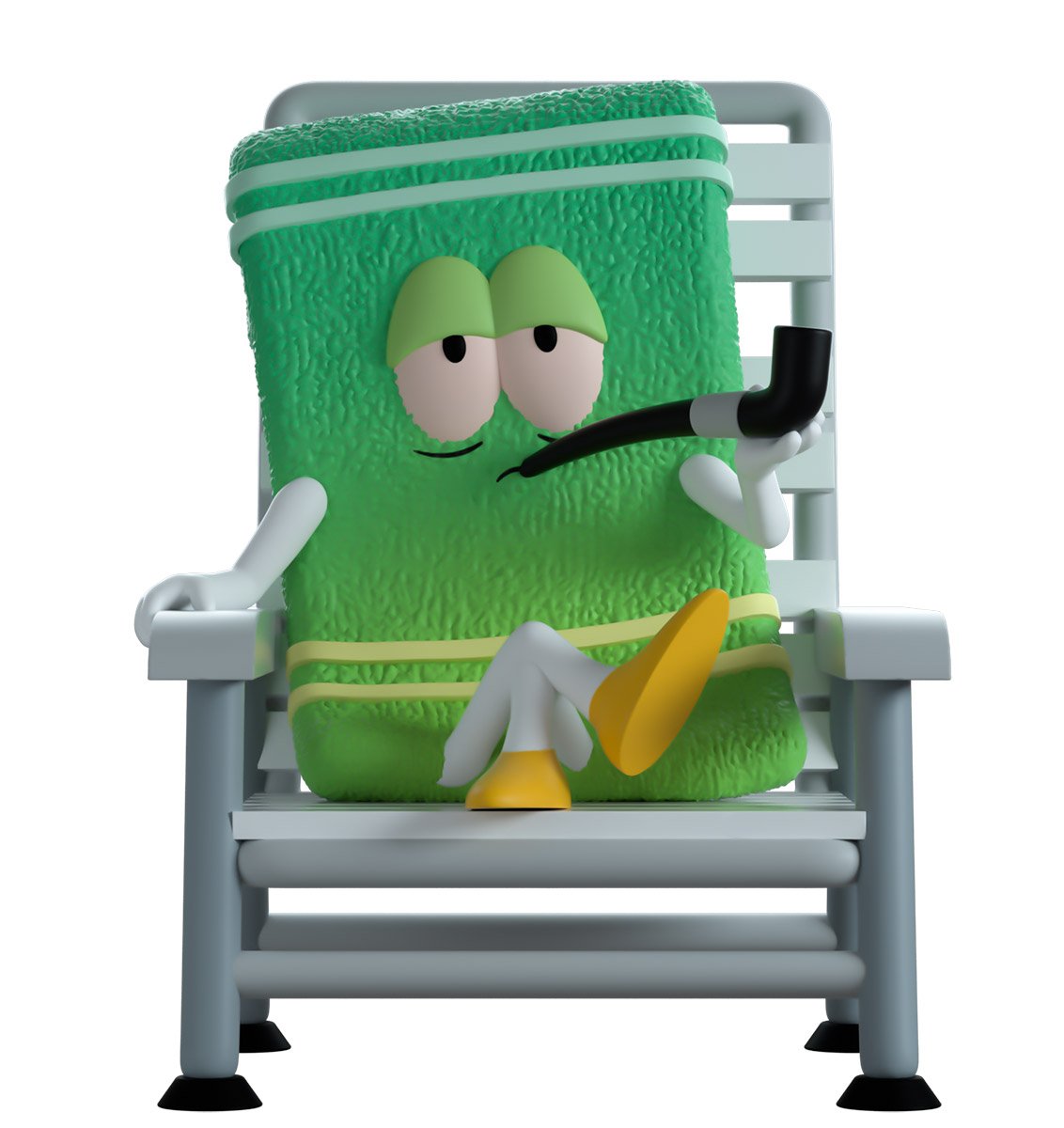Oooooooh mon garçon, quelqu'un se sent très chanceux cette année. S'asseoir sur une chaise de jardin en plastique dans une attitude extrêmement détendue est le préféré de tous, Towelie ! Avec ses yeux mi-ouverts et le blanc de ses yeux juste un tout petit peu rose, Towelie est dans l'esprit de la Saint-Patrick car il est passé de son bleu normal à un ton vert plus festif. Il est assis le dos appuyé contre la chaise, les jambes croisées devant lui. Son bras droit repose sur l'accoudoir à côté de lui tandis que sa main gauche est occupée à tenir un tuyau noir attaché à sa bouche. Hé, ça a été une longue semaine, donne une pause à cet homme. L'extérieur de son emballage à double paroi montre une terre agricole, avec une grange et une maison en vue, entourées de verdure tout autour. L'intérieur est le logo de South Park se répétant sur un motif en niveaux de gris. La pochette de protection montre Cartman, Stan, Kenny et Kyle regardant depuis les coins sur un fond noir. Cet objet de collection est livré dans une pochette extérieure de protection mate en relief et un protecteur en plastique de taille personnalisée pour une protection maximale pendant l'expédition. expédition.
