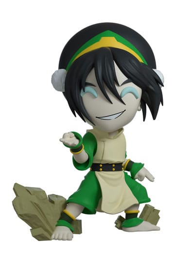 Intelligente, puissante et impertinente comme toujours, la maîtresse de la terre Toph adopte une position de combat puissante à 4,3 pouces de hauteur, les bras larges, les mains tordues lorsqu'elle se déplace au sol. Elle est vêtue d'une longue tunique verte, la taille enveloppée dans une ceinture arrière. Ses cheveux noirs saisissants sont sculptés en chignon, tandis qu'un bandeau vert et jaune avec des bouffées couronne sa tête. Des monticules de terre découverte dépassent de derrière ses pieds. Son emballage extérieur présente une représentation de Toph pliant des rochers, avec une carte des quatre nations dessinée à l'intérieur.