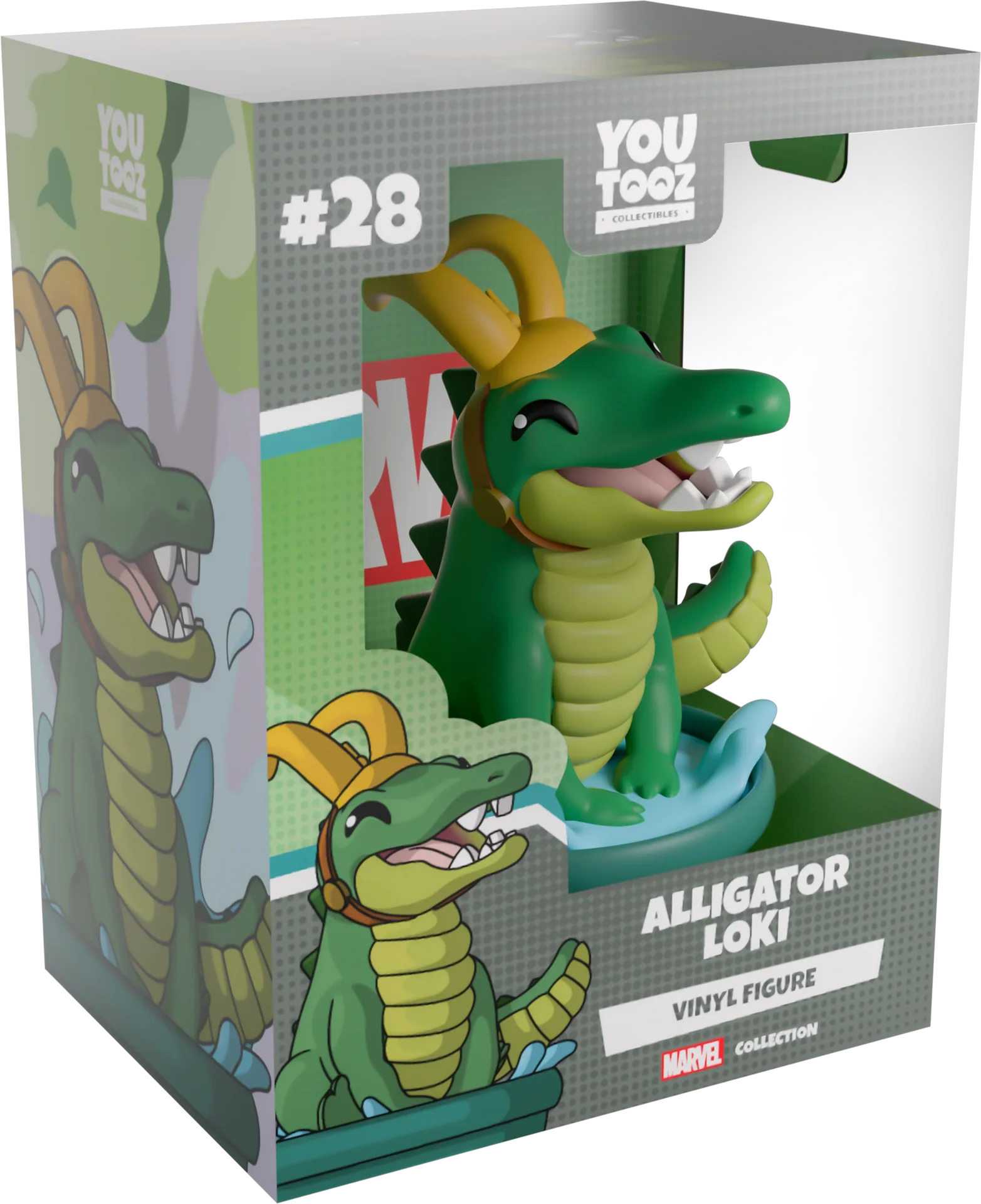 Espere, isso também é um Loki? Sentado em uma piscina rasa de água verde, com 10,7 cm de altura, com o rosto se abrindo em um sorriso banguela sob olhos brilhantes, ele usa um capacete amarelo com chifres curvos presos à cabeça. Com a parte inferior segmentada em verde-claro, grandes espinhos percorrem suas costas verde-escuras e a cauda grossa que envolve sua frente. O exterior de sua embalagem o vê quase totalmente submerso na água em meio a uma floresta tranquila, enquanto o interior é preenchido com raios de luz verde. A capa protetora então o leva mais para dentro da bela floresta, enquanto sua silhueta pode ser vista através da grande janela transparente na frente da embalagem. Este colecionável vem em uma capa externa protetora fosca em relevo e um protetor de plástico de tamanho personalizado para máxima proteção durante o transporte.Sobre o Loki Jacaré