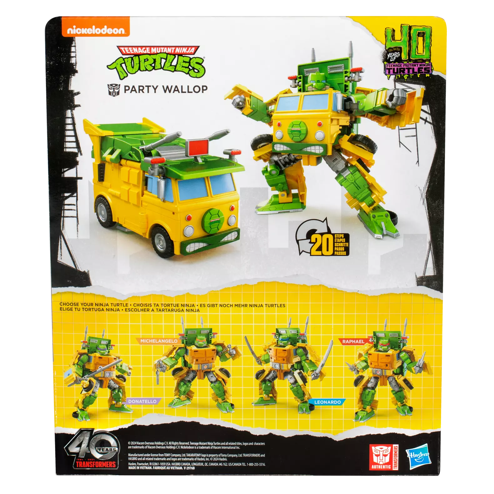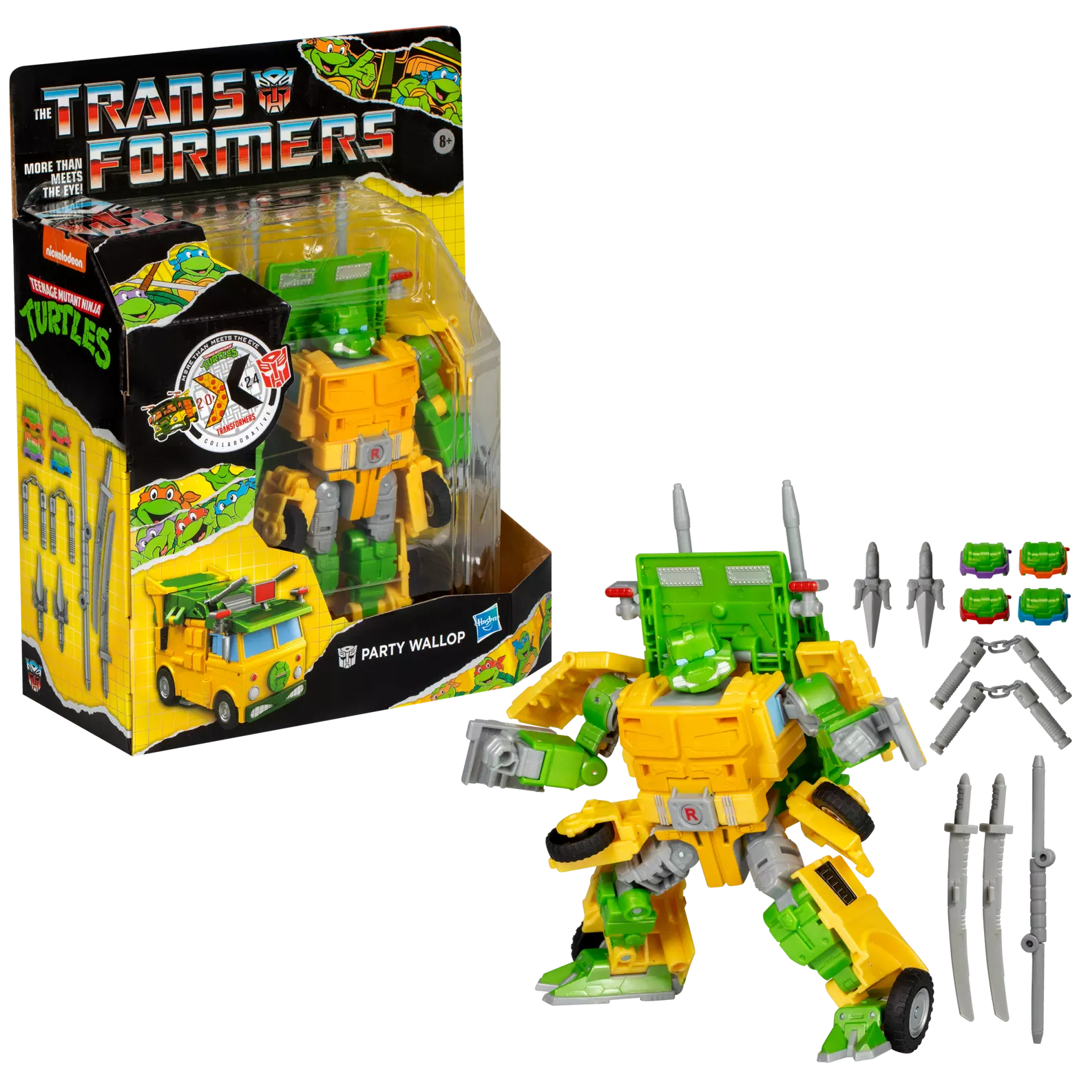 Botët e robotëve Transformers dhe Turtles Teenage Mutant Ninja përplasen me këtë figurë bashkëpunimi Transformers TMNT Party Wallop! Furgoni ikonik nga filmi vizatimor Teenage Mutant Ninja Turtles tani është një robot Transformers! Kjo figurë në shkallë 6.9 inç shndërrohet nga modaliteti robot në furgon me dekor dhe dizajn besnik ndaj filmit vizatimor klasik të vitit 1987. Kjo pako përfshin aksesorë të frymëzuar nga vizatimet si shpata ninja, një shkop bo, nunchacks dhe sai për të pajisur vëllezërit breshka. Gjithashtu përfshihen 4 koka të ndërrueshme dhe një tokëz rripi rrotulluese për ta personalizuar robotin në një figurë Donatello, Michelangelo, Leonardo ose Raphael. Robotët Transformers kanë qenë gjithmonë më të fortë nga sa duket, përveç tani, falë Transformers Collaborative, fansat mund të përjetojnë këta personazhe më të mëdhenj se sa duket, ndërsa bashkohen me personazhe dhe ekipe të tjera që ndajnë të njëjtën cilësi të veçantë.