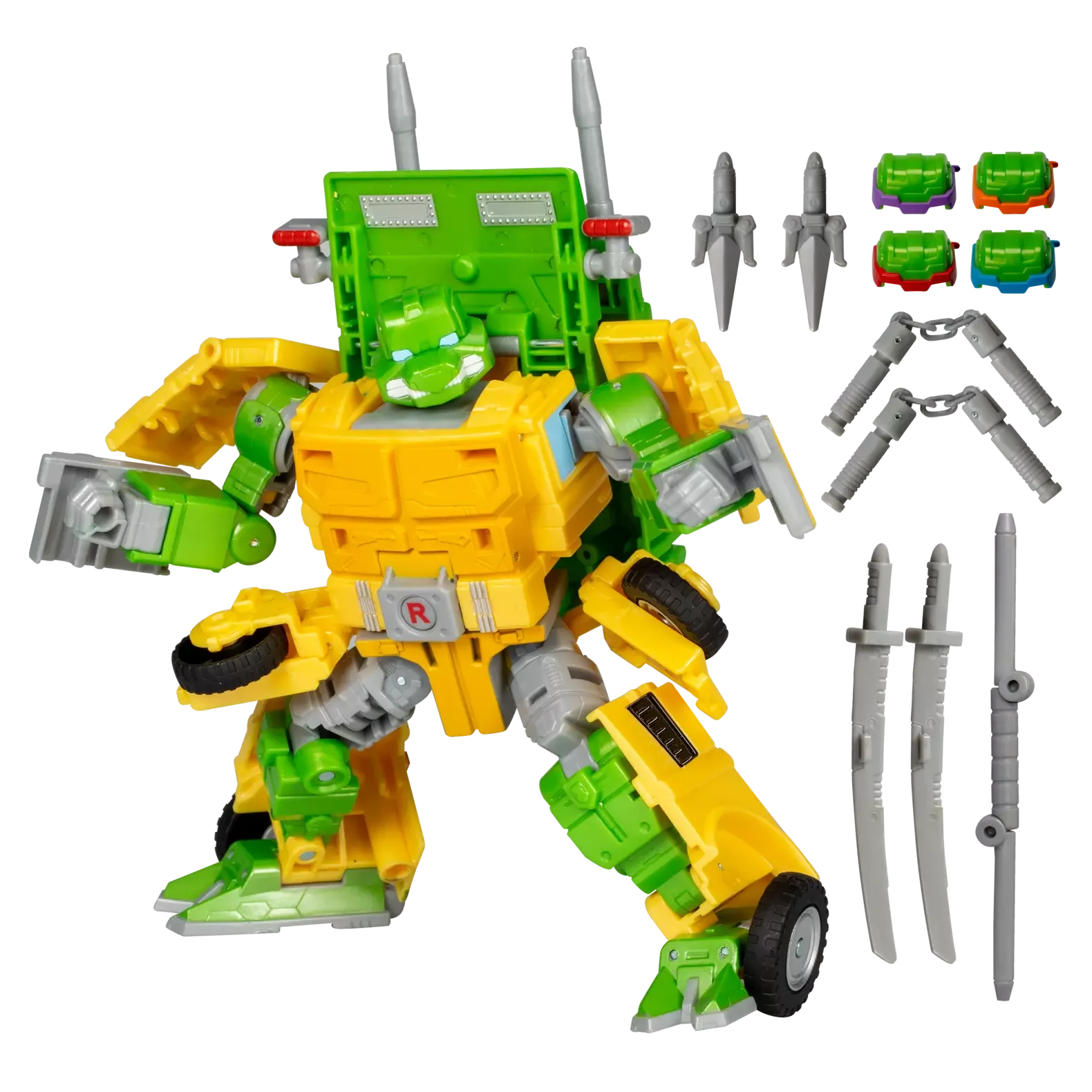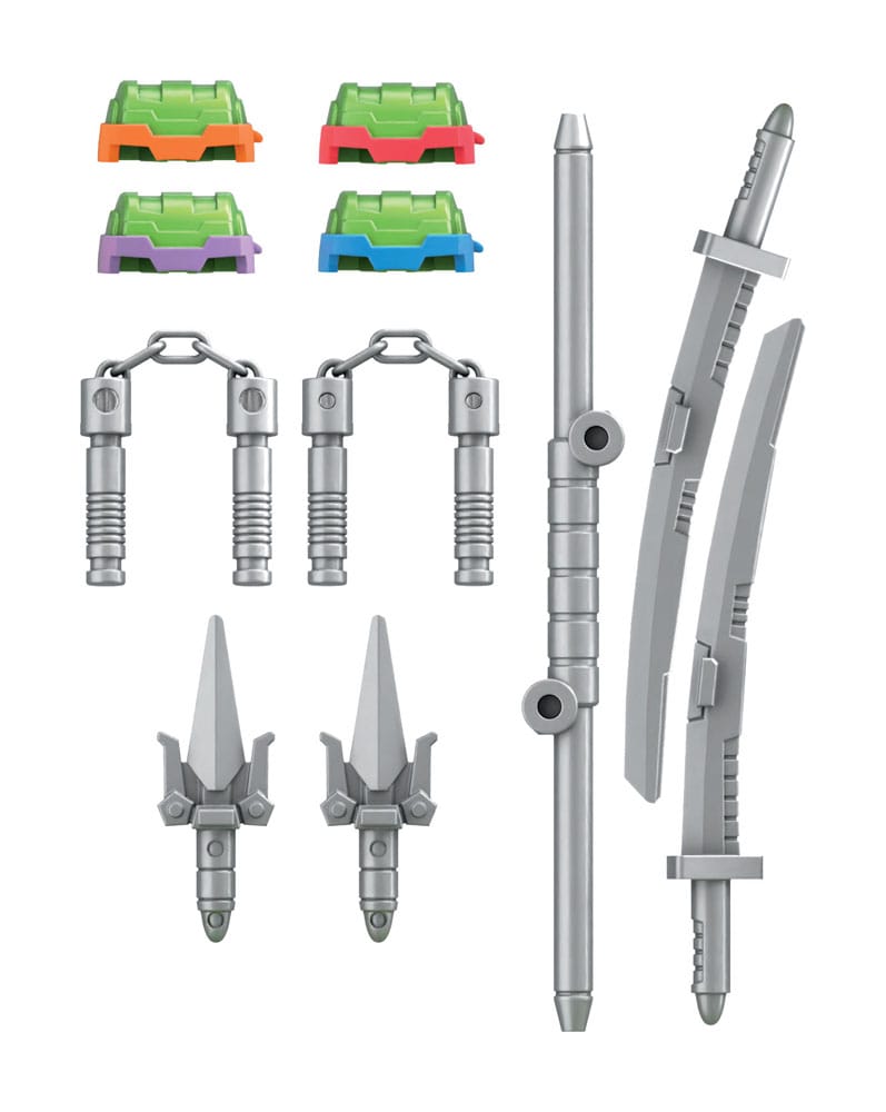 - Përfshin 2 shpata ninja, 1 shkop bo, 2 nunchaku, 2 sai, një tokëz rripi rrotulluese dhe 4 koka të ndërrueshme për modalitetin robot.